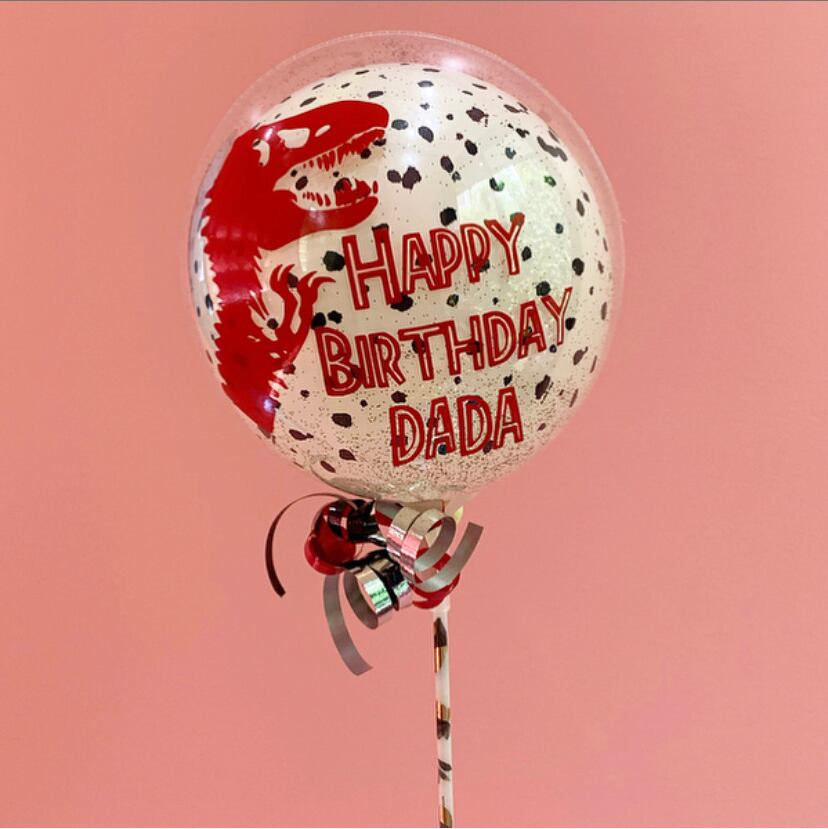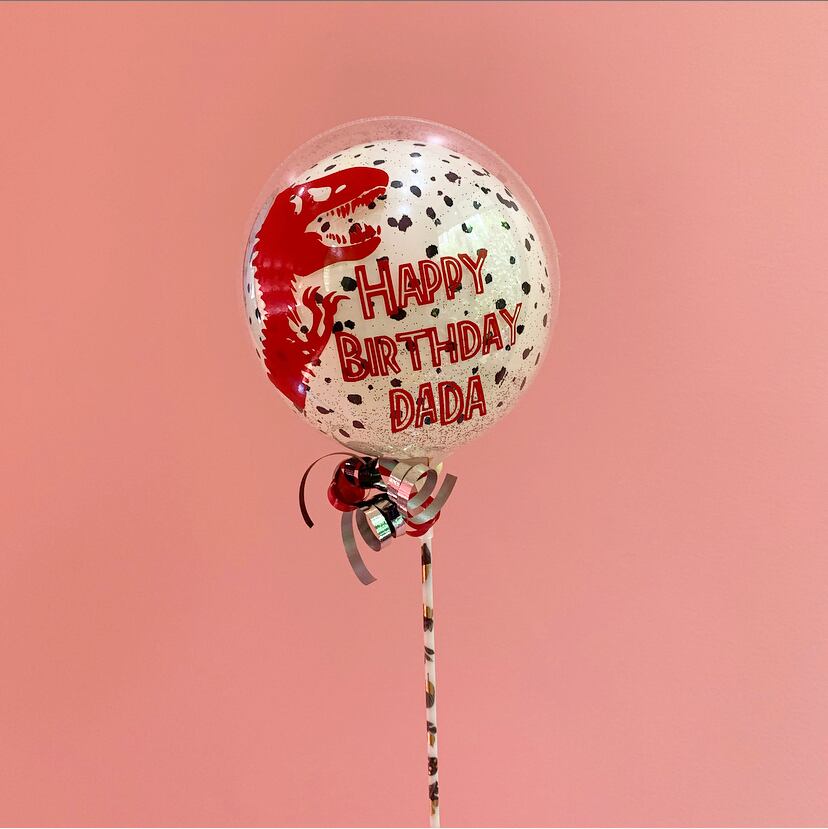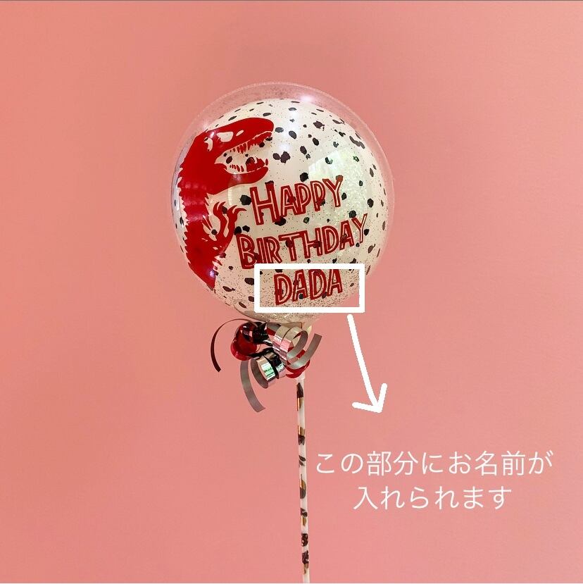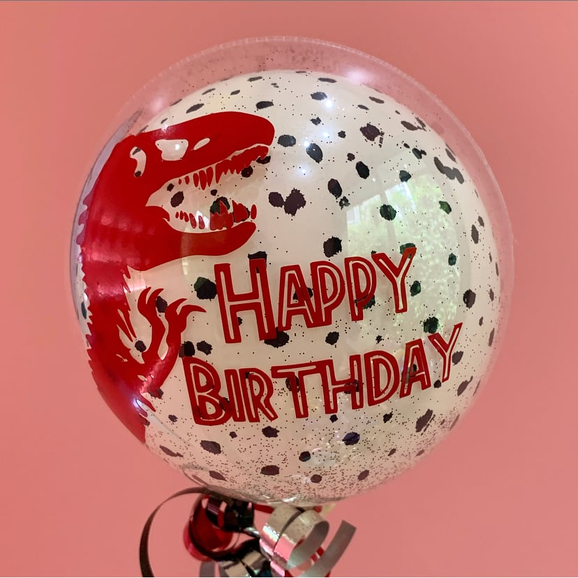 クリアバルーンの中は恐竜の卵の様なバルーンとキラキラのグリッターが入っています。