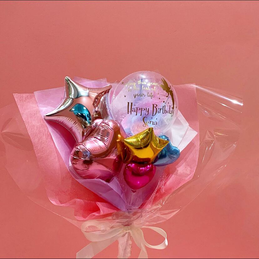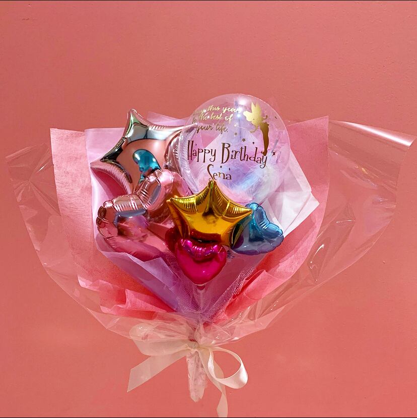 ピンクを基調に、カラフルな星やハートのバルーンでお作りした女の子におすすめのバースデーブーケです!