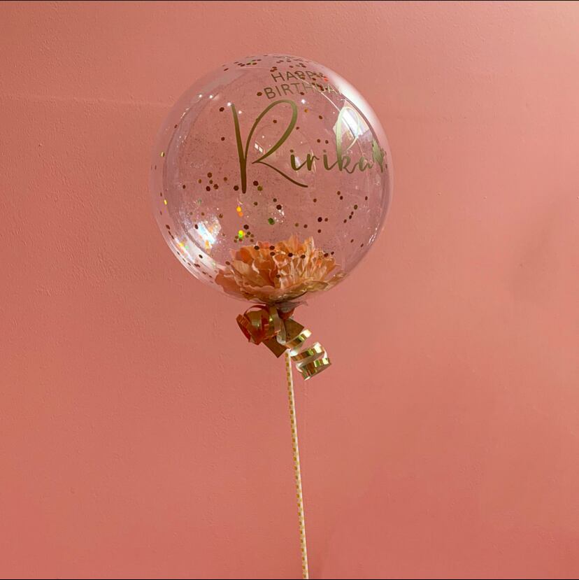 クリアバルーンの中にピンクダリアとキラキラのグリッターが入った新作スティックバルーンです。