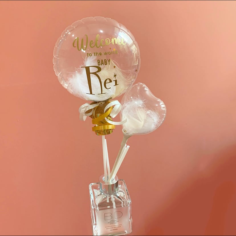 バルーンには【welcome to the world baby + お名前】(訳)かわいい赤ちゃん!この世界へようこそ